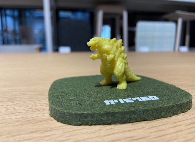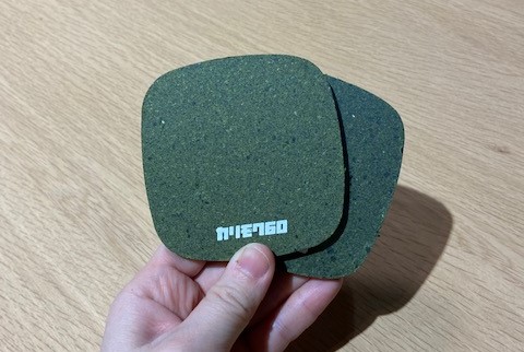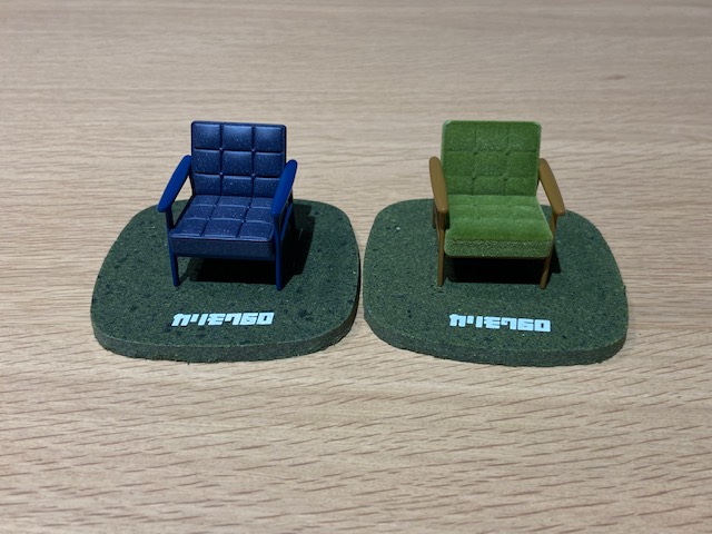 モケットグリーンのコースターと聞くと、あのモケモケ生地をコースター型にしたイメージがありましたが、このコースターはカリモクさんがこのスプリングフェアの為に新しく作ったものなんです!モケットグリーンの端材を利用してできた繊維リサイクルボードをコースター型に抜き、カリモク60ブランドロゴをシルクプリントした、特別品◎