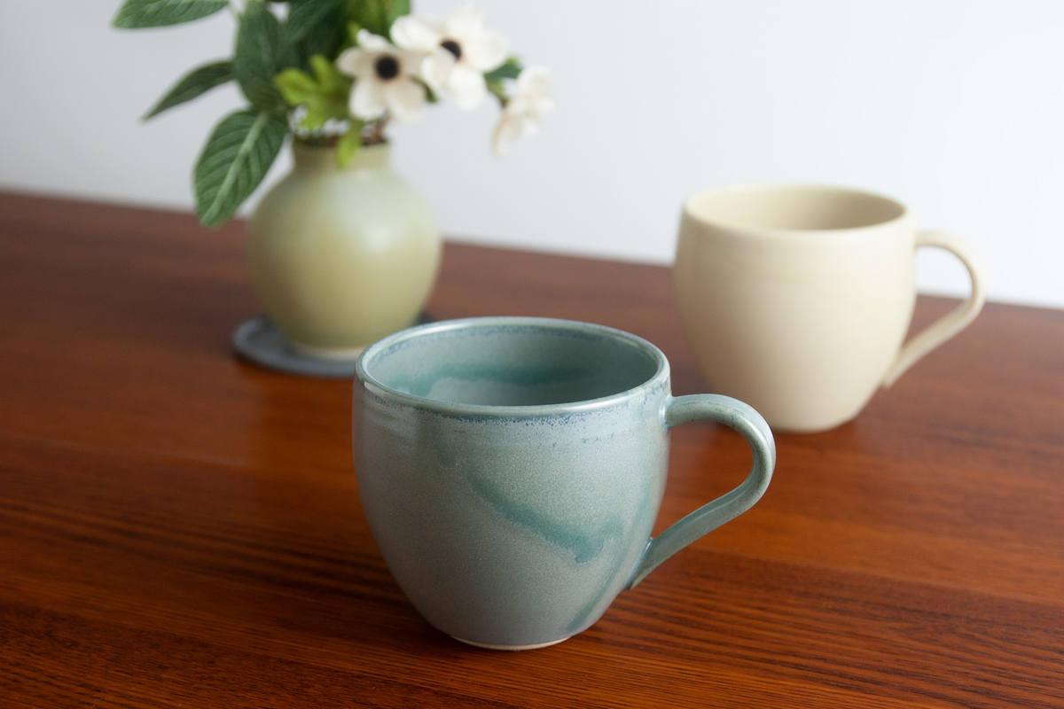 プロダクトと作家モノのちょうどあいだをいくようなコバヤシポタリースタジオの作品たち。まったく同じ形に見えてもよくみるとひとつずつ揺らぎがあり、それぞれ小林さんの手で作った一点ものです。 手になじみやすいカップやお料理が映えるお皿など、今回は本当にたくさんの作品が並びますので、ぜひ実物を手に取って見てくださいね。